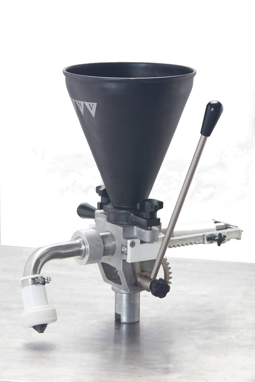 The manually operated dosing unit works by vacuum and allows to regulate the dose from 15 to 60 gr, and the hopper can contain up to 5 liters of filling. The fillings suitable for the dispenser can be of any type CUTTED MEAT TO KNIFE, VEGETABLE, HUMITA, HAM AND CHEESE, etc. Provided your BASE IS MOISTURE WITH SOLIDS IN SUSPENSION